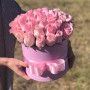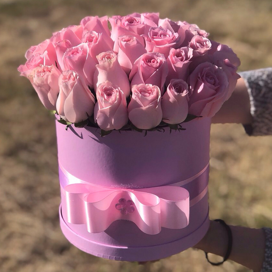 На фото 27 розовых роз в шляпной коробке. В составе: роза 27 шт, коробка (s) 1 шт, атласная лента 1 шт, . Все цветы свежие и ароматные, букет красиво оформлен и отлично подходит для подарка. Доступна доставка цветов или самовывоз.