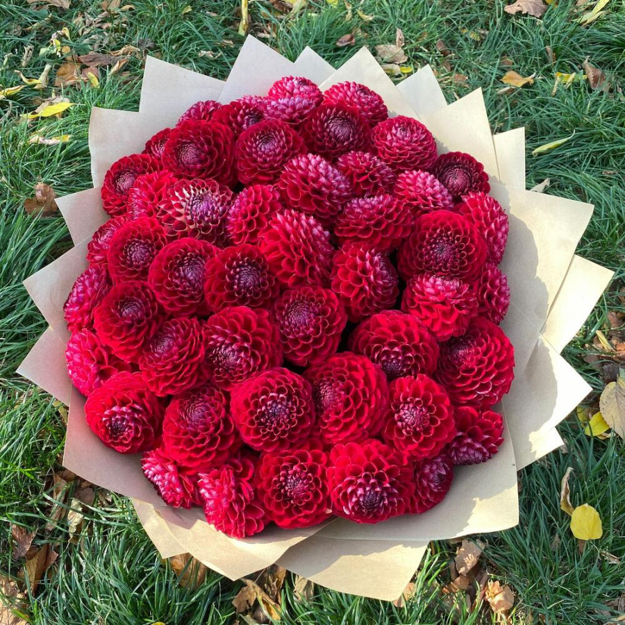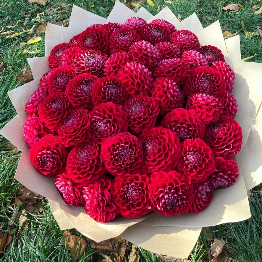 На фото букет из 49 красных георгин. В составе: георгина 49 шт, фоамиран 3 шт, атласная лента 2 шт, . Все цветы свежие и ароматные, букет красиво оформлен и отлично подходит для подарка. Доступна доставка цветов или самовывоз.