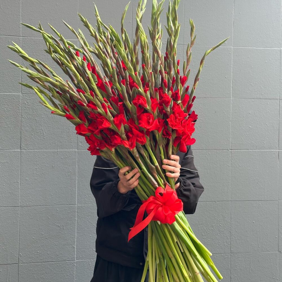 На фото букет из 49 красных гладиолусов. В составе: гладиолус 49 шт, атласная лента 1 шт, . Все цветы свежие и ароматные, букет красиво оформлен и отлично подходит для подарка. Доступна доставка цветов или самовывоз.