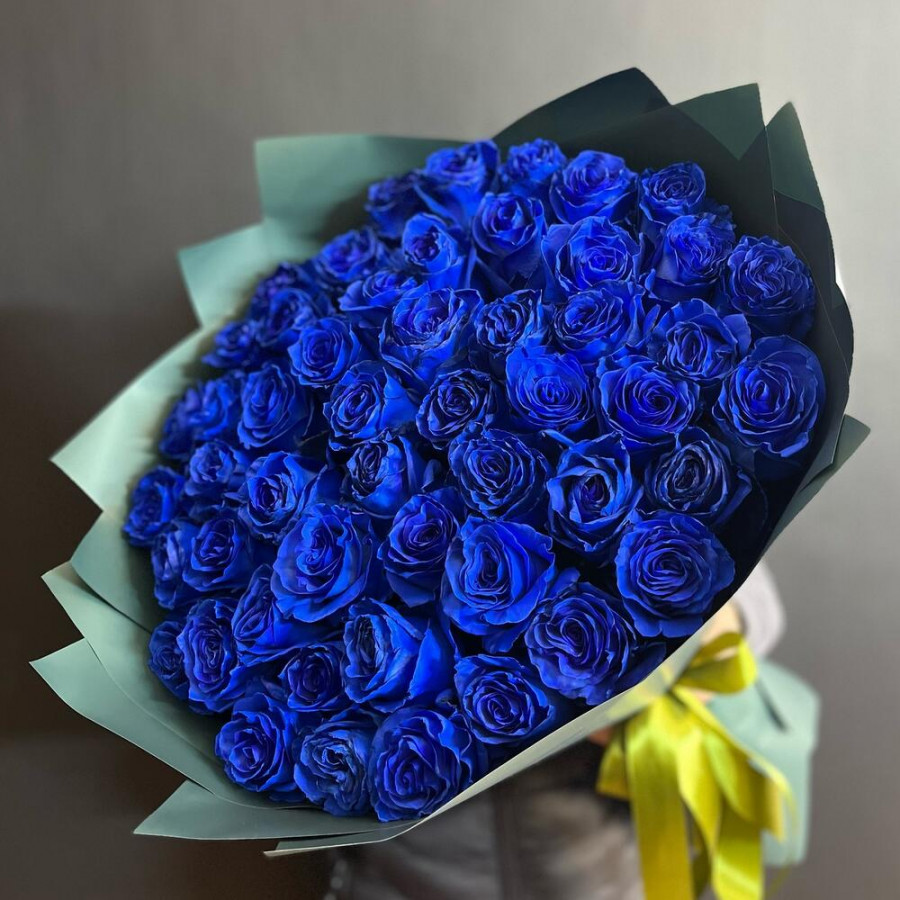 На фото 49 синих роз в дизайнерской упаковке. В составе: роза (синяя) 49 шт, дизайнерская упаковка 2 шт, атласная лента 1 шт, . Все цветы свежие и ароматные, букет красиво оформлен и отлично подходит для подарка. Доступна доставка цветов или самовывоз.