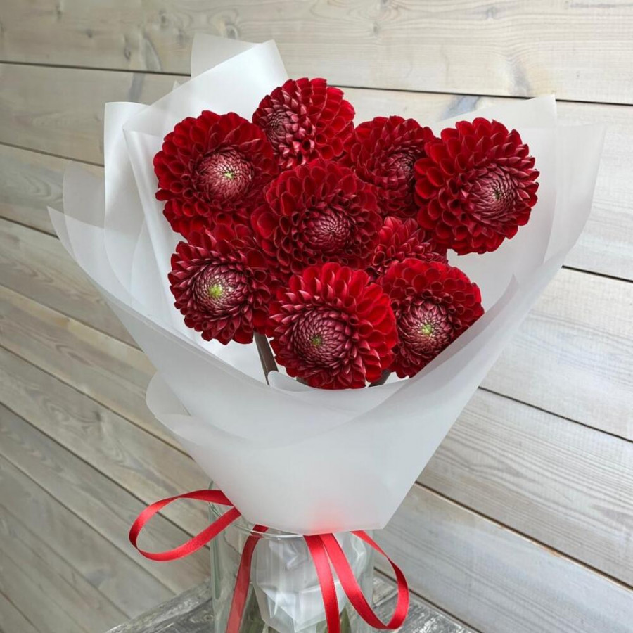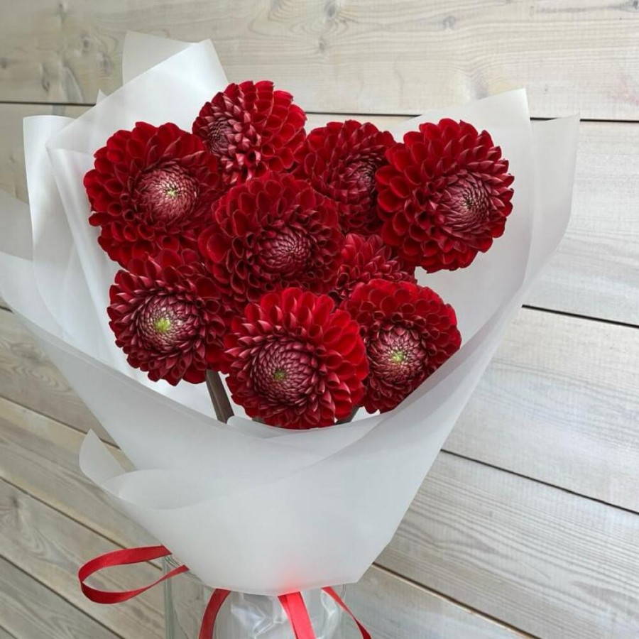 На фото букет из 9 красных георгин. В составе: георгина 9 шт, дизайнерская упаковка 1 шт, атласная лента 1 шт, . Все цветы свежие и ароматные, букет красиво оформлен и отлично подходит для подарка. Доступна доставка цветов или самовывоз.