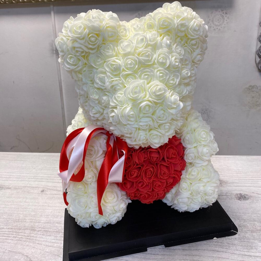 На фото большой мишка из белых роз 40 см. В составе: . Все цветы свежие и ароматные, букет красиво оформлен и отлично подходит для подарка. Доступна доставка цветов или самовывоз.