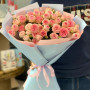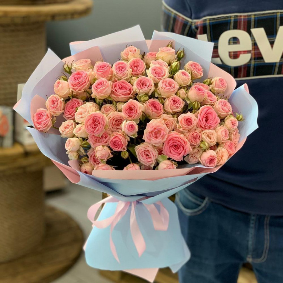 На фото букет из 15 кустовых роз. В составе: кустовая роза 15 шт, крафт-бумага 2 шт, атласная лента 1 шт, . Все цветы свежие и ароматные, букет красиво оформлен и отлично подходит для подарка. Доступна доставка цветов или самовывоз.