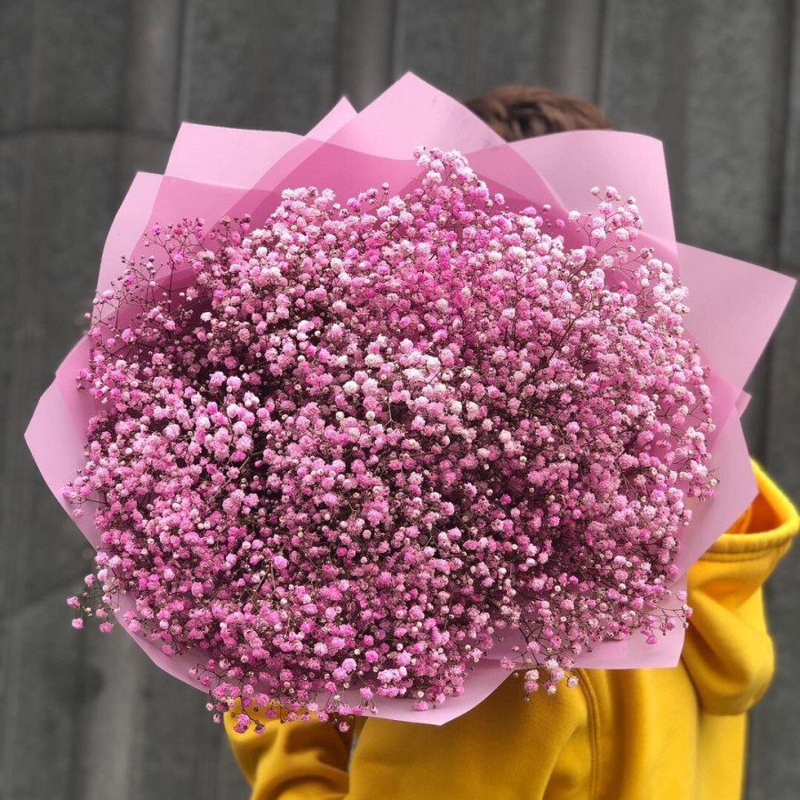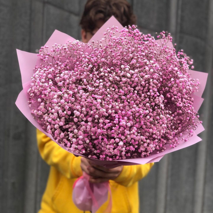 На фото букет из 15 розовых гипсофил. В составе: гипсофила 15 шт, крафт-бумага 1 шт, атласная лента 1 шт, . Все цветы свежие и ароматные, букет красиво оформлен и отлично подходит для подарка. Доступна доставка цветов или самовывоз.