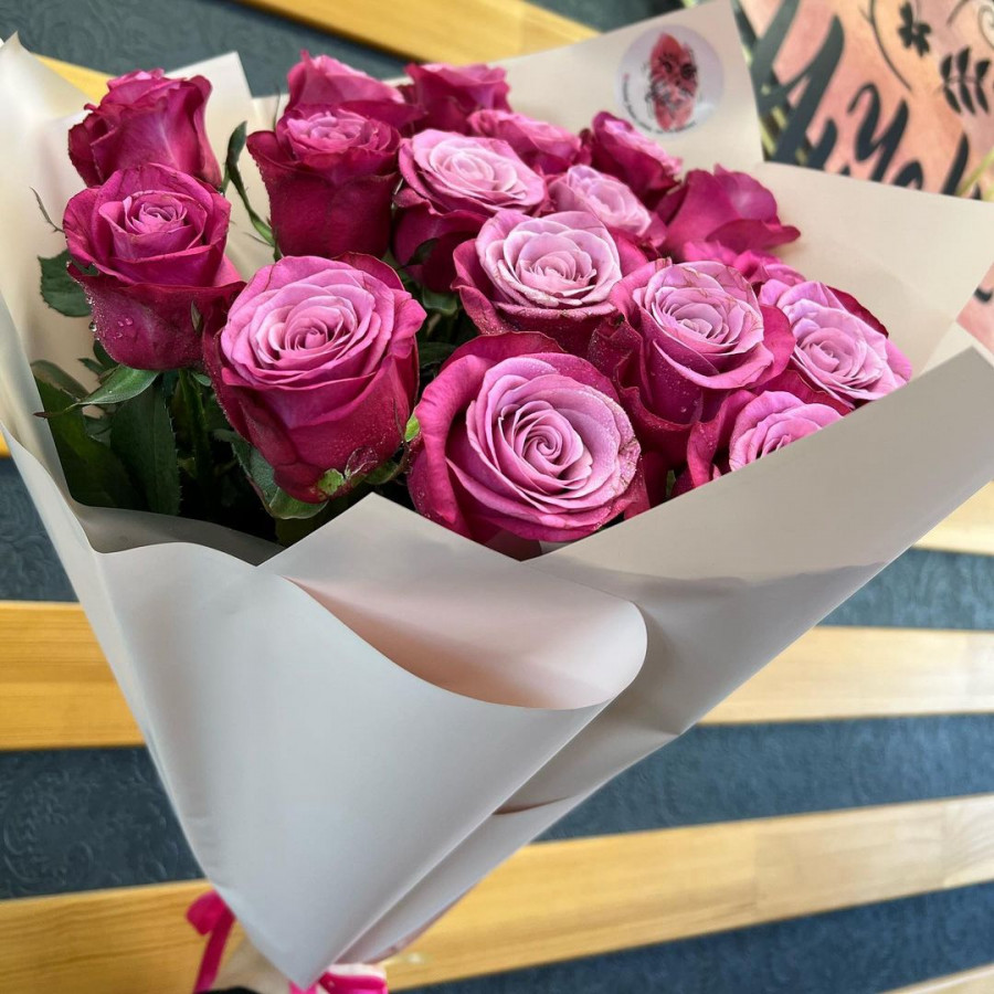 На фото букет из 17 фиолетовых роз. В составе: роза 17 шт, крафт-бумага 1 шт, атласная лента 1 шт, . Все цветы свежие и ароматные, букет красиво оформлен и отлично подходит для подарка. Доступна доставка цветов или самовывоз.
