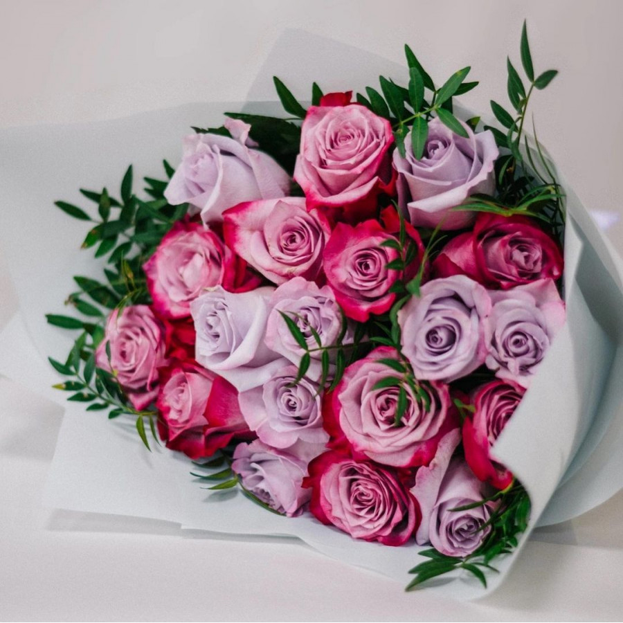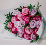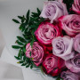На фото букет из 19 фиолетовых роз. В составе: роза 19 шт, писташ 2 шт, крафт-бумага 1 шт, атласная лента 1 шт, . Все цветы свежие и ароматные, букет красиво оформлен и отлично подходит для подарка. Доступна доставка цветов или самовывоз.