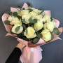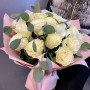 На фото букет из 21 белой розы. В составе: роза 21 шт, эвкалипт 2 шт, крафт-бумага 1 шт, . Все цветы свежие и ароматные, букет красиво оформлен и отлично подходит для подарка. Доступна доставка цветов или самовывоз.
