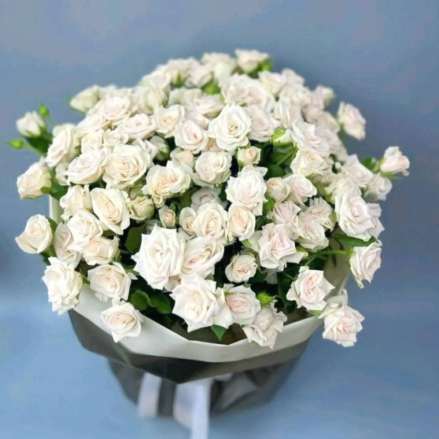 На фото букет из 25 белых кустовых роз. В составе: кустовая роза 25 шт, крафт-бумага 1 шт, атласная лента 1 шт, . Все цветы свежие и ароматные, букет красиво оформлен и отлично подходит для подарка. Доступна доставка цветов или самовывоз.