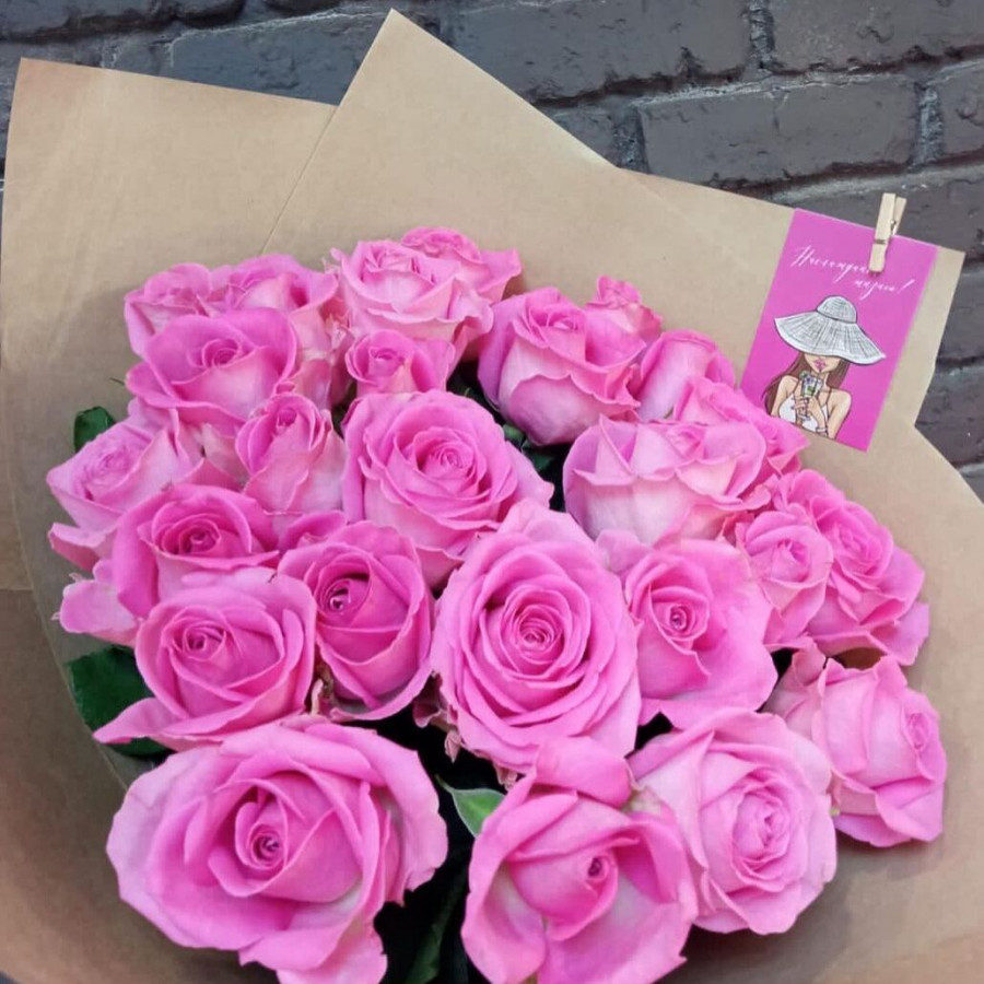 На фото букет из 25 розовых кенийский роз. В составе: роза (кения) 25 шт, крафт-бумага 1 шт, атласная лента 1 шт, . Все цветы свежие и ароматные, букет красиво оформлен и отлично подходит для подарка. Доступна доставка цветов или самовывоз.