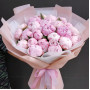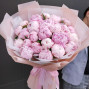 На фото букет из 25 розовых пионов. В составе: пион 25 шт, крафт-бумага 1 шт, атласная лента 1 шт, . Все цветы свежие и ароматные, букет красиво оформлен и отлично подходит для подарка. Доступна доставка цветов или самовывоз.