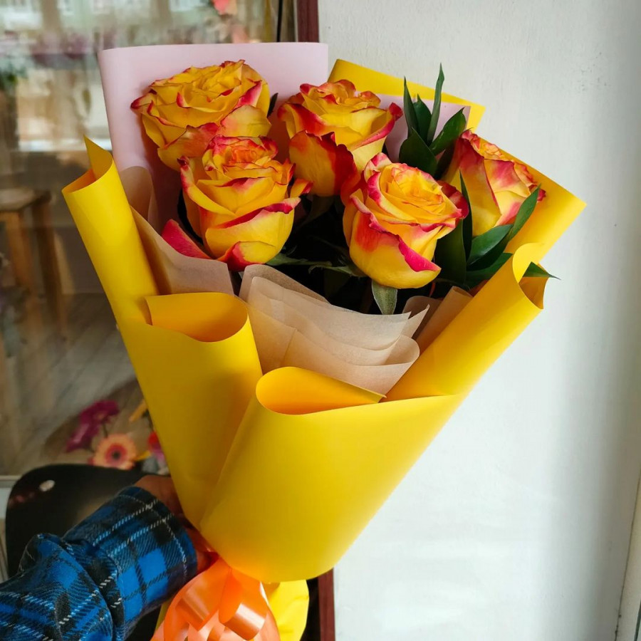 На фото букет из 5 желтых роз. В составе: роза 5 шт, крафт-бумага 1 шт, атласная лента 1 шт, . Все цветы свежие и ароматные, букет красиво оформлен и отлично подходит для подарка. Доступна доставка цветов или самовывоз.