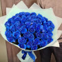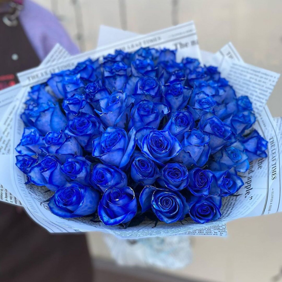 На фото букет из 51 синей розы. В составе: роза (синяя) 51 шт, крафт-бумага 1 шт, атласная лента 1 шт, . Все цветы свежие и ароматные, букет красиво оформлен и отлично подходит для подарка. Доступна доставка цветов или самовывоз.