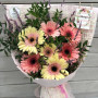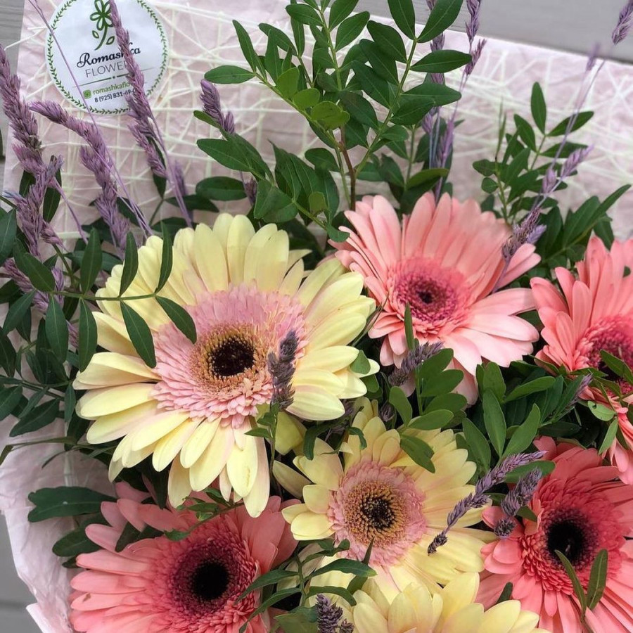 На фото букет из 7 нежных гербер. В составе: гербера 7 шт, писташ 2 шт, статица 2 шт, крафт-бумага 1 шт, атласная лента 1 шт, . Все цветы свежие и ароматные, букет красиво оформлен и отлично подходит для подарка. Доступна доставка цветов или самовывоз.