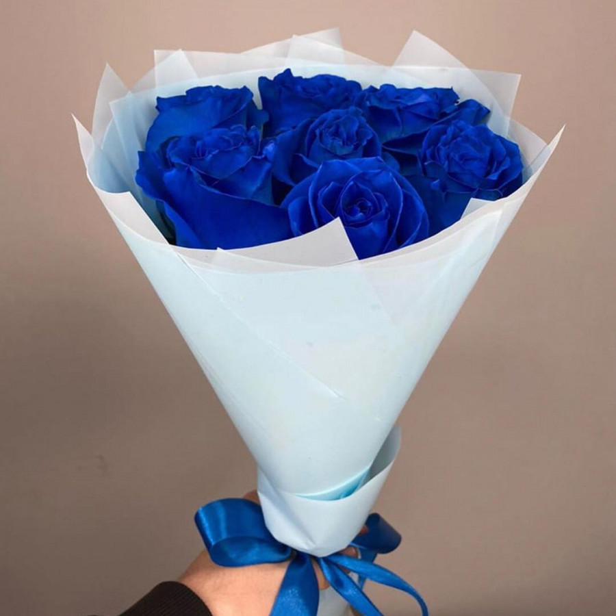 На фото букет из 7 синих роз. В составе: роза (синяя) 7 шт, фетр 1 шт, атласная лента 1 шт, . Все цветы свежие и ароматные, букет красиво оформлен и отлично подходит для подарка. Доступна доставка цветов или самовывоз.