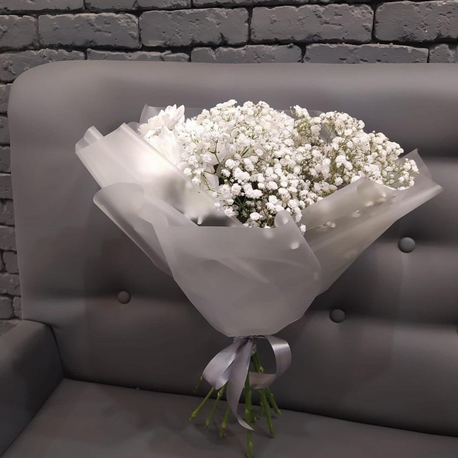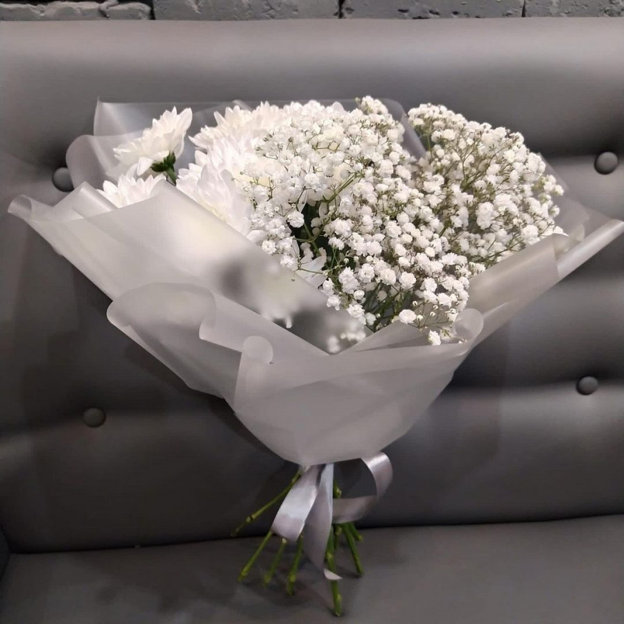 На фото букет из белой хризантемы и белой гипсофилы. В составе: хризантема кустовая 3 шт, гипсофила 2 шт, крафт-бумага 1 шт, атласная лента 1 шт, . Все цветы свежие и ароматные, букет красиво оформлен и отлично подходит для подарка. Доступна доставка цветов или самовывоз.