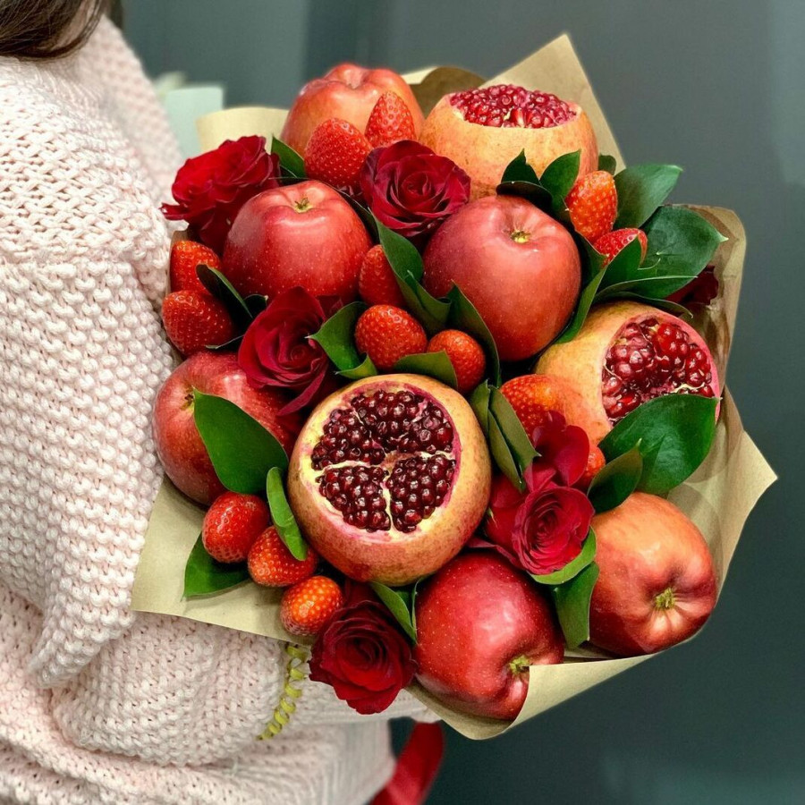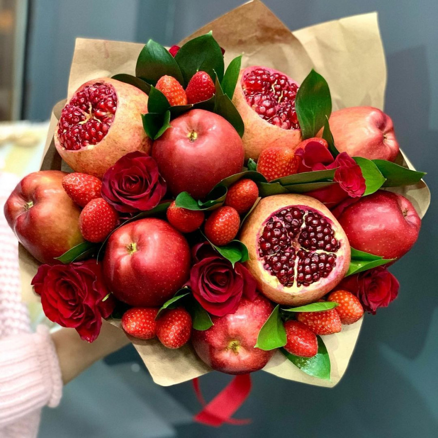На фото букет из граната и яблок. В составе: гранат 3 шт, яблоко 5 шт, клубника 15 шт, роза 5 шт, салал 1 шт, крафт-бумага 1 шт, атласная лента 1 шт, . Все цветы свежие и ароматные, букет красиво оформлен и отлично подходит для подарка. Доступна доставка цветов или самовывоз.