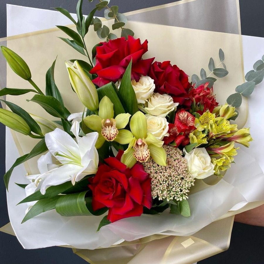 На фото букет из лилий и красных роз. В составе: лилия 2 шт, роза 5 шт, кустовая роза 2 шт, орхидея 2 шт, эвкалипт 2 шт, крафт-бумага 1 шт, атласная лента 1 шт, . Все цветы свежие и ароматные, букет красиво оформлен и отлично подходит для подарка. Доступна доставка цветов или самовывоз.