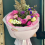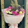 На фото букет из пионовидных роз с сухоцветом. В составе: кустовая пионовидная роза 2 шт, роза 2 шт, пампасная трава 1 шт, эустома (лизиантус) 1 шт, гвоздика 1 шт, брасика 1 шт, статица 1 шт, хамелациум 1 шт, крафт-бумага 1 шт, . Все цветы свежие и ароматные, букет красиво оформлен и отлично подходит для подарка. Доступна доставка цветов или самовывоз.