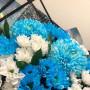 На фото букет из синих и белых хризантем. В составе: хризантема одноголовая 2 шт, хризантема кустовая 7 шт, крафт-бумага 1 шт, атласная лента 1 шт, . Все цветы свежие и ароматные, букет красиво оформлен и отлично подходит для подарка. Доступна доставка цветов или самовывоз.