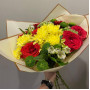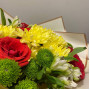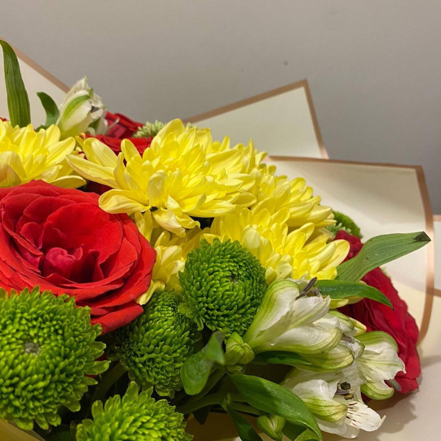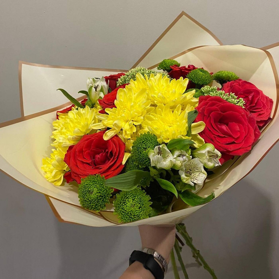 На фото букет из желтых хризантем и красных роз. В составе: хризантема кустовая 3 шт, роза 7 шт, альстромерия 2 шт, крафт-бумага 1 шт, атласная лента 1 шт, . Все цветы свежие и ароматные, букет красиво оформлен и отлично подходит для подарка. Доступна доставка цветов или самовывоз.