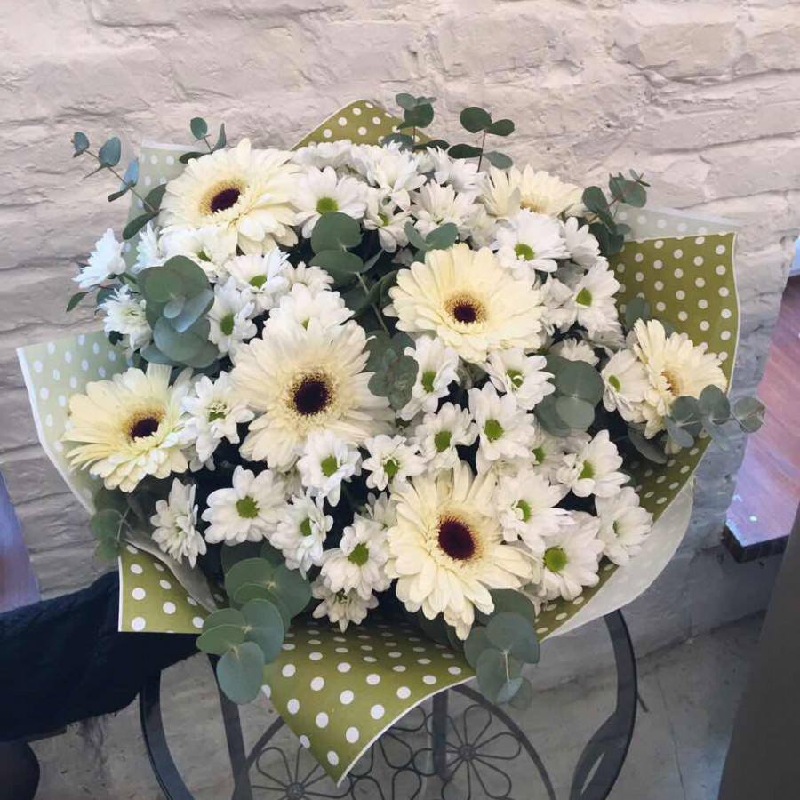 Оригинальное переплетение веточек кустовой ромашковидной хризантемы и светлых кремовых гербер в сочетании со свежими мятными оттенками эвкалипта в обворожительном лёгком и большом, словно облако, букете для очаровательной получательницы! Необычная упаковка из крафта и фетра дополняет образ букета, который станет незабываемым подарком.
