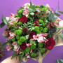 Яркое необычное сочетание зеленых кустовых хризантем, насыщенно бордовых роз, искристых веточек альстромерий и густой экзотической зелени - это не только оригинальный самостоятельный подарок, но и чудесное дополнение к любому празднику. Такой букет вызовет восхищение даже у самых изысканных представительниц прекрасного пола.