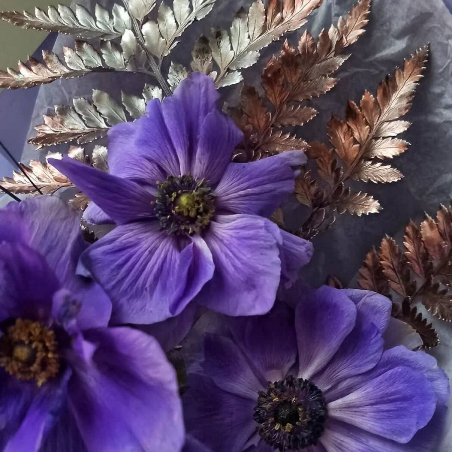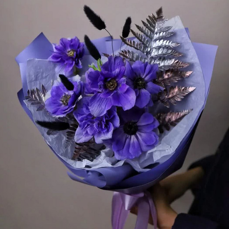На фото букет с синими анемонами. В составе: анемон 7 шт, папоротник 2 шт, крафт-бумага 1 шт, атласная лента 1 шт, . Все цветы свежие и ароматные, букет красиво оформлен и отлично подходит для подарка. Доступна доставка цветов или самовывоз.