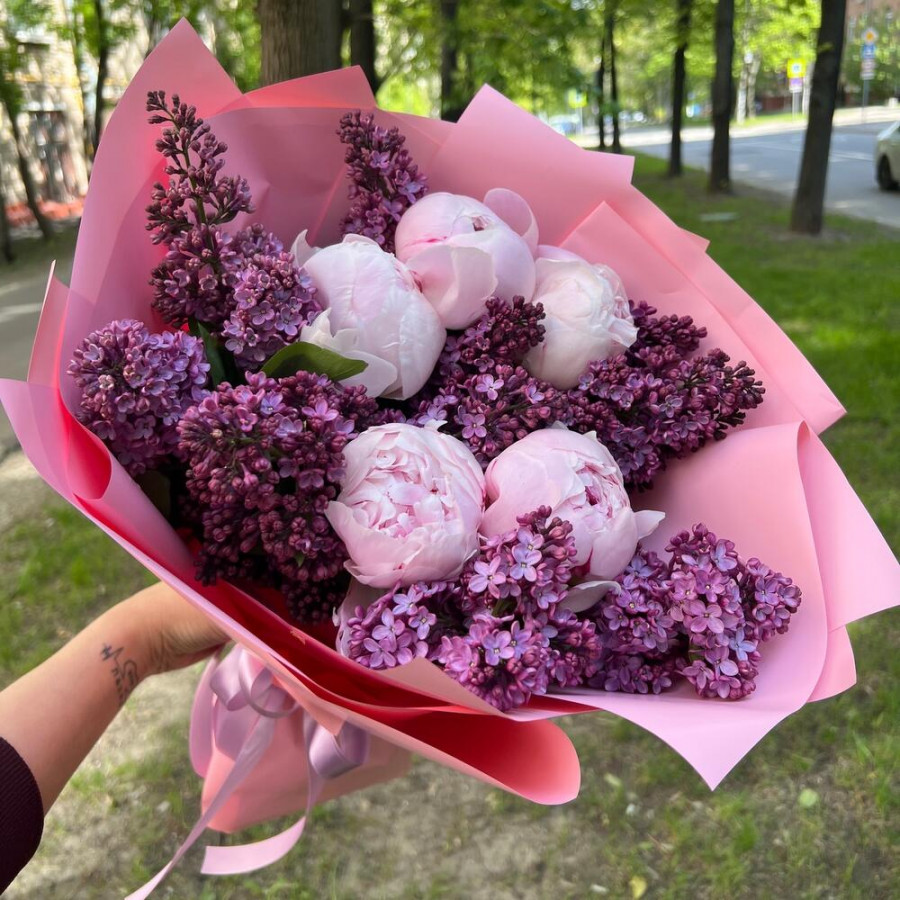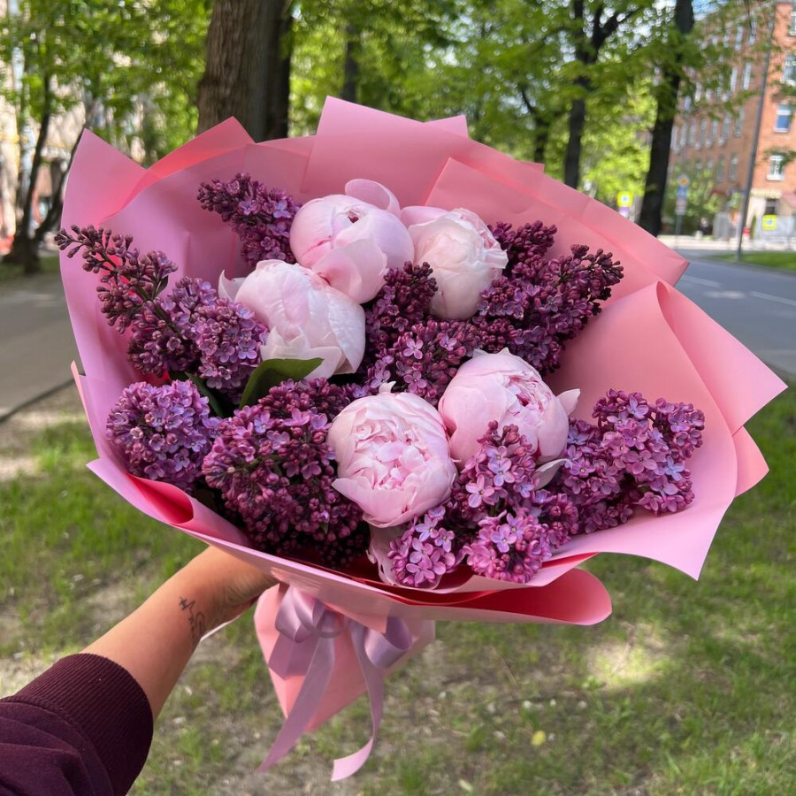 На фото букет сирени с пионами. В составе: сирень 4 шт, пион 5 шт, дизайнерская упаковка 1 шт, атласная лента 1 шт, . Все цветы свежие и ароматные, букет красиво оформлен и отлично подходит для подарка. Доступна доставка цветов или самовывоз.