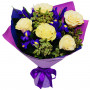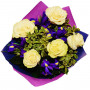 Контрастное сочетание 5 крупных белых роз и 4 ирисов в яркой упаковке из синего и фиолетового фетра - это удивительный необычный подарок для любительниц оригинальных презентов, который способен скрасить вечер получательницы и заставит её еще долго думать об отправителе.