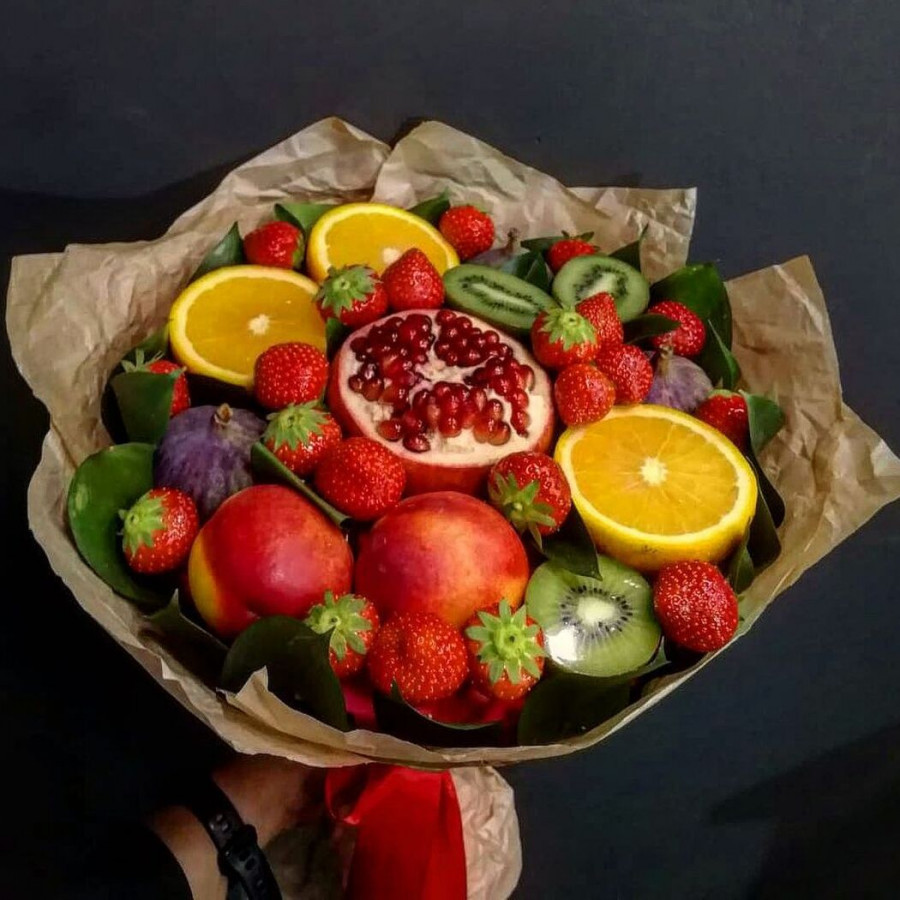 На фото фруктовый букет с гранатом. В составе: гранат 1 шт, инжир 2 шт, клубника 21 шт, киви 2 шт, апельсин 2 шт, крафт-бумага 1 шт, атласная лента 1 шт, . Все цветы свежие и ароматные, букет красиво оформлен и отлично подходит для подарка. Доступна доставка цветов или самовывоз.