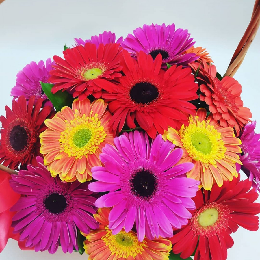 На фото композиция из 15 разноцветных гербер в корзине. В составе: гербера 15 шт, корзина (s) 1 шт, . Все цветы свежие и ароматные, букет красиво оформлен и отлично подходит для подарка. Доступна доставка цветов или самовывоз.
