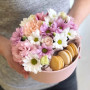 На фото маленькая коробка с макарунами и цветами. В составе: макаруны 3 шт, хризантема кустовая 2 шт, роза 2 шт, эустома (лизиантус) 2 шт, гвоздика 1 шт, коробка (s) 1 шт, . Все цветы свежие и ароматные, букет красиво оформлен и отлично подходит для подарка. Доступна доставка цветов или самовывоз.