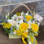 На фото мимоза с желтыми розами в деревянном ящике. В составе: роза 3 шт, мимоза 2 шт, кустовая роза 3 шт, гербера 2 шт, эустома (лизиантус) 3 шт, маттиола 2 шт, деревянный ящик (s) 1 шт, . Все цветы свежие и ароматные, букет красиво оформлен и отлично подходит для подарка. Доступна доставка цветов или самовывоз.