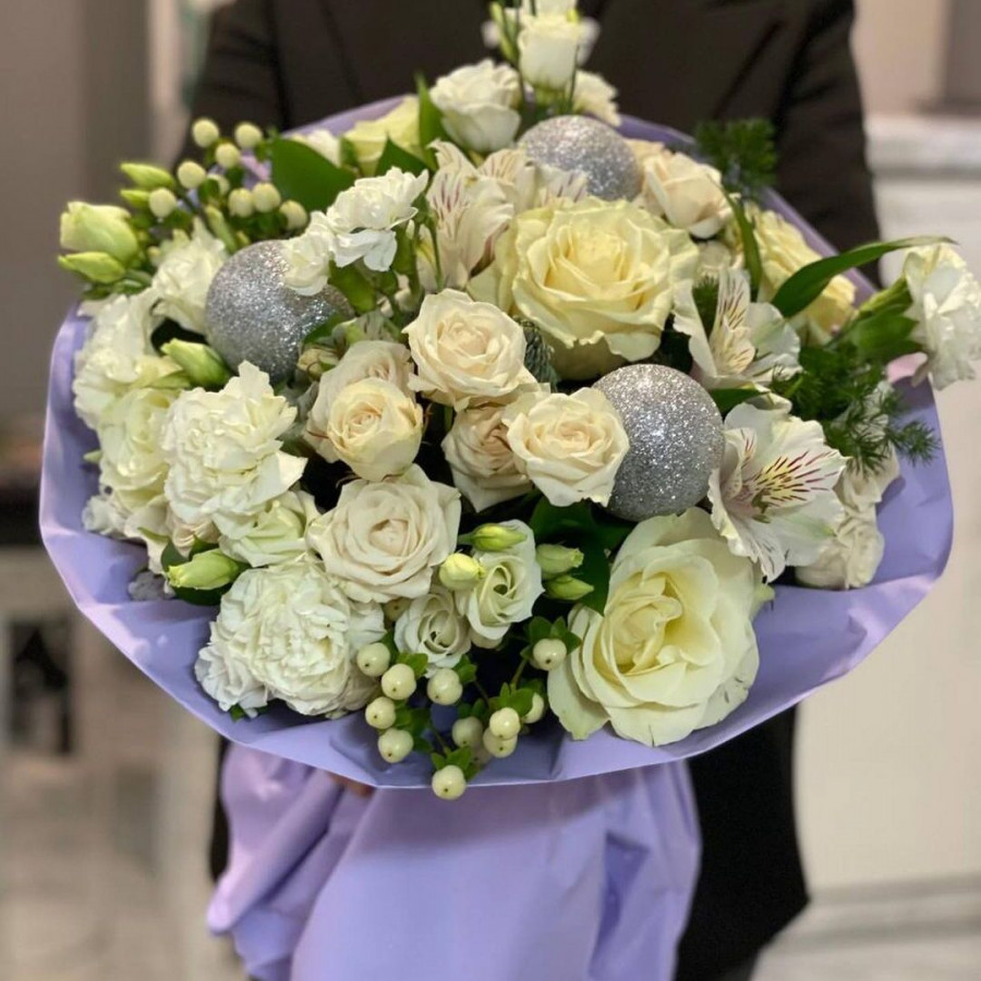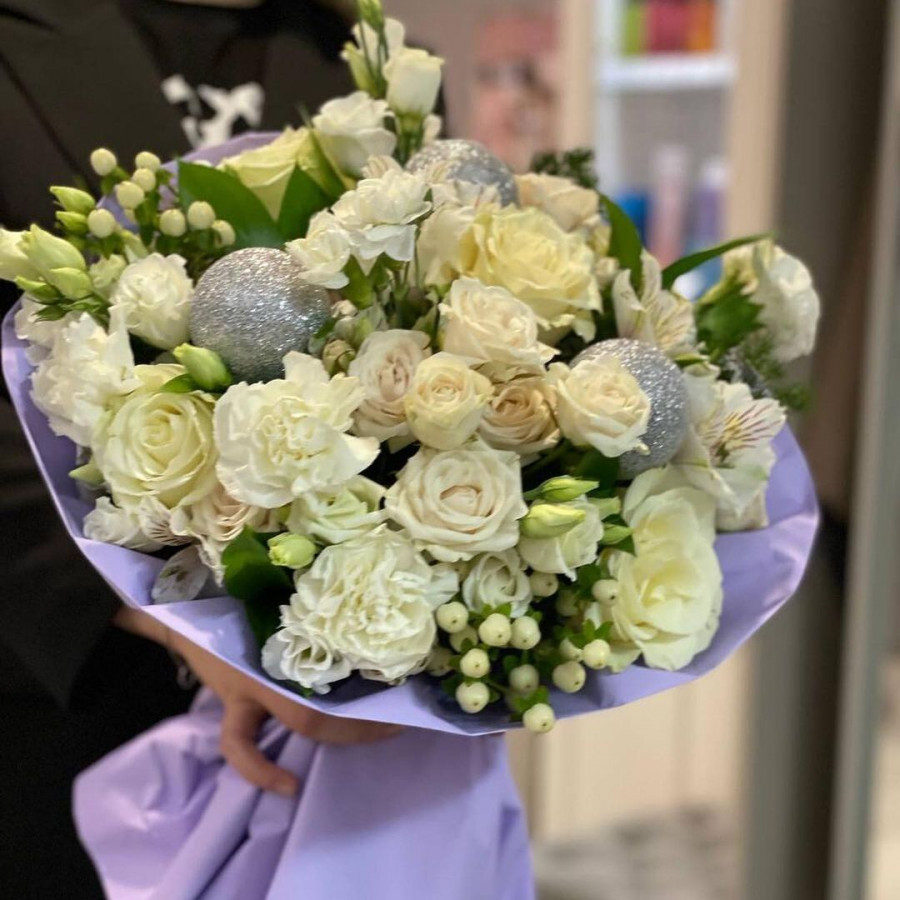 На фото новогодний букет с белыми розами. В составе: роза 3 шт, кустовая роза 2 шт, альстромерия 2 шт, эустома (лизиантус) 2 шт, гвоздика 2 шт, гиперикум 2 шт, елочная игрушка 3 шт, крафт-бумага 1 шт, атласная лента 1 шт, . Все цветы свежие и ароматные, букет красиво оформлен и отлично подходит для подарка. Доступна доставка цветов или самовывоз.