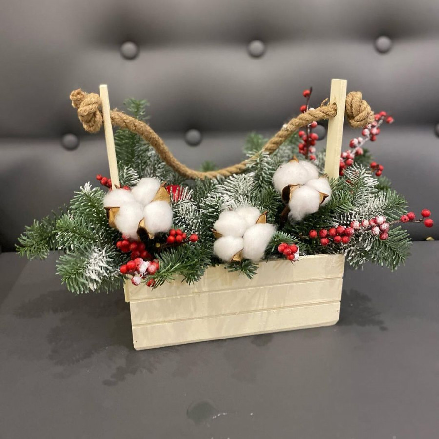На фото новогодняя композиция в деревянном ящике. В составе: рябина 3 шт, еловая ветка 2 шт, хлопок 3 шт, деревянный ящик (s) 1 шт, . Все цветы свежие и ароматные, букет красиво оформлен и отлично подходит для подарка. Доступна доставка цветов или самовывоз.