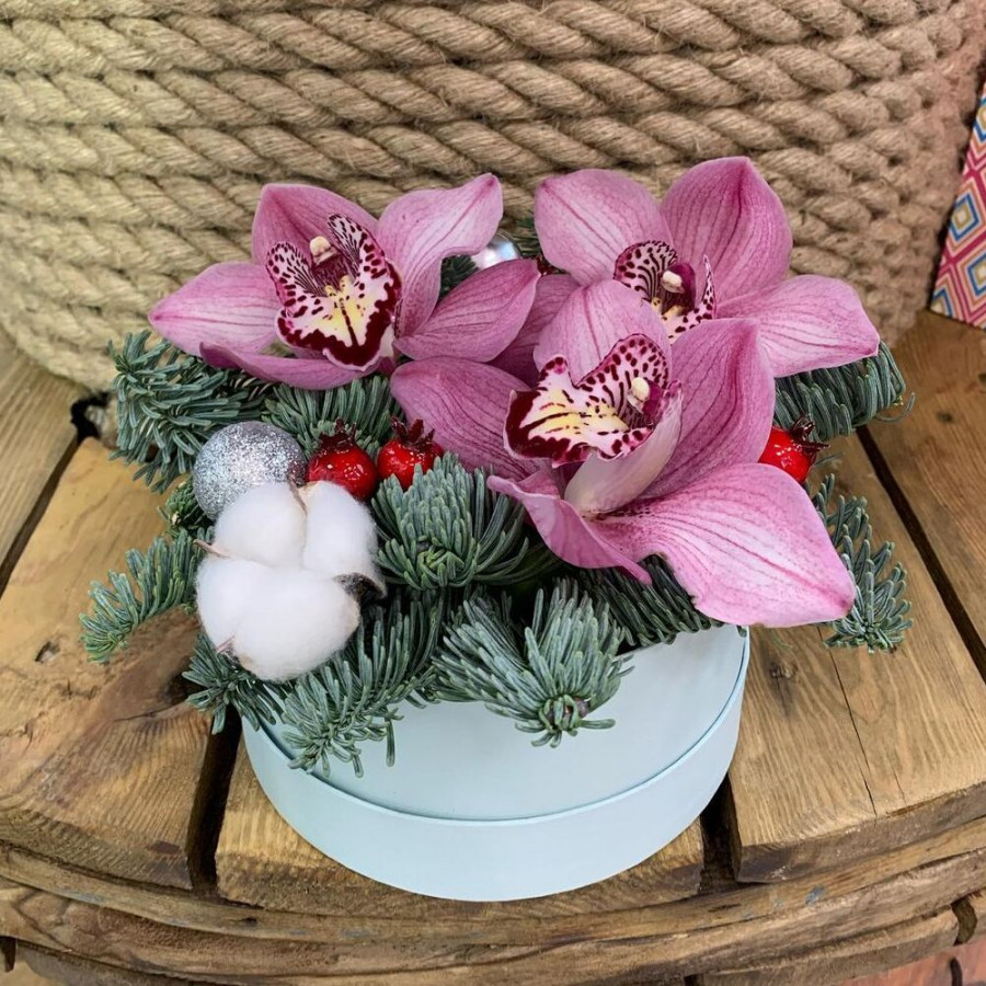На фото новогодняя мини композиция. В составе: еловая ветка 1 шт, орхидея 3 шт, хлопок 1 шт, елочная игрушка 1 шт, корзина (s) 1 шт, . Все цветы свежие и ароматные, букет красиво оформлен и отлично подходит для подарка. Доступна доставка цветов или самовывоз.