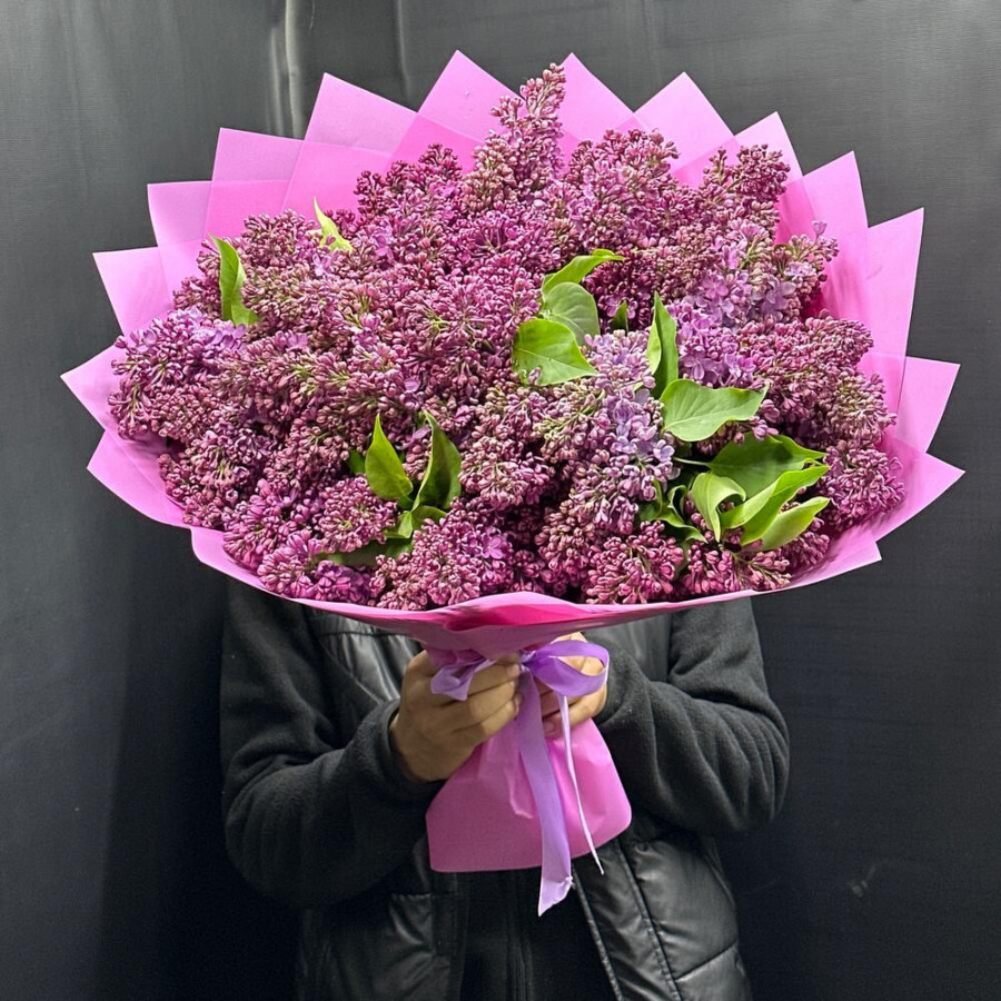 На фото огромный букет из сирени. В составе: сирень 29 шт, дизайнерская упаковка 4 шт, атласная лента 1 шт, . Все цветы свежие и ароматные, букет красиво оформлен и отлично подходит для подарка. Доступна доставка цветов или самовывоз.