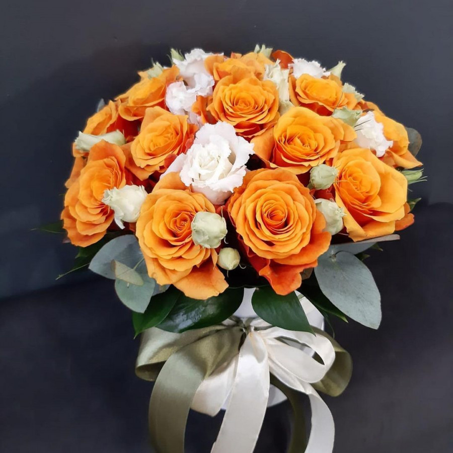 На фото розы с эустомой в шляпной коробке. В составе: роза 13 шт, эустома (лизиантус) 4 шт, эвкалипт 1 шт, шляпная коробка (s) 1 шт, . Все цветы свежие и ароматные, букет красиво оформлен и отлично подходит для подарка. Доступна доставка цветов или самовывоз.